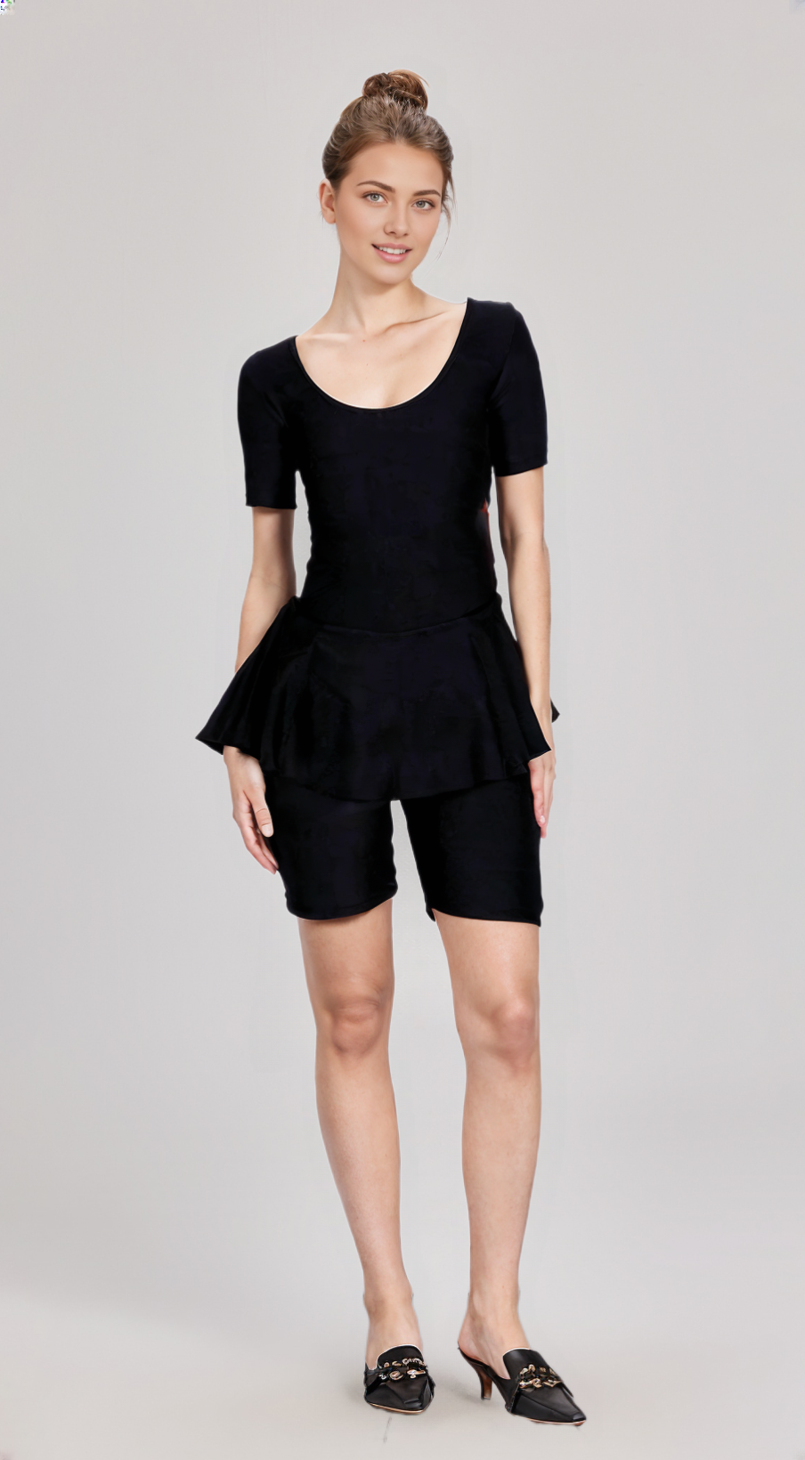 Make a splash with Ucofit’s stylish Black Swimsuit, designed to enhance both performance and aesthetics. This swimsuit features a flattering short-sleeve top paired with a flared skirt overlay, offering a modest yet trendy look. The attached knee-length shorts provide full coverage and comfort, making it ideal for swimming, water aerobics, or beach outings.